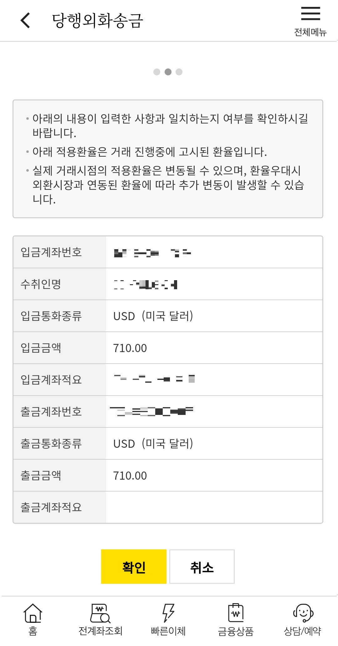 6. 최종적으로 계좌번호, 수취 인명, 출금 금액 등을 확인하는 창이 나오는데요, 이상이 없으면 확인 버튼을 누릅니다.