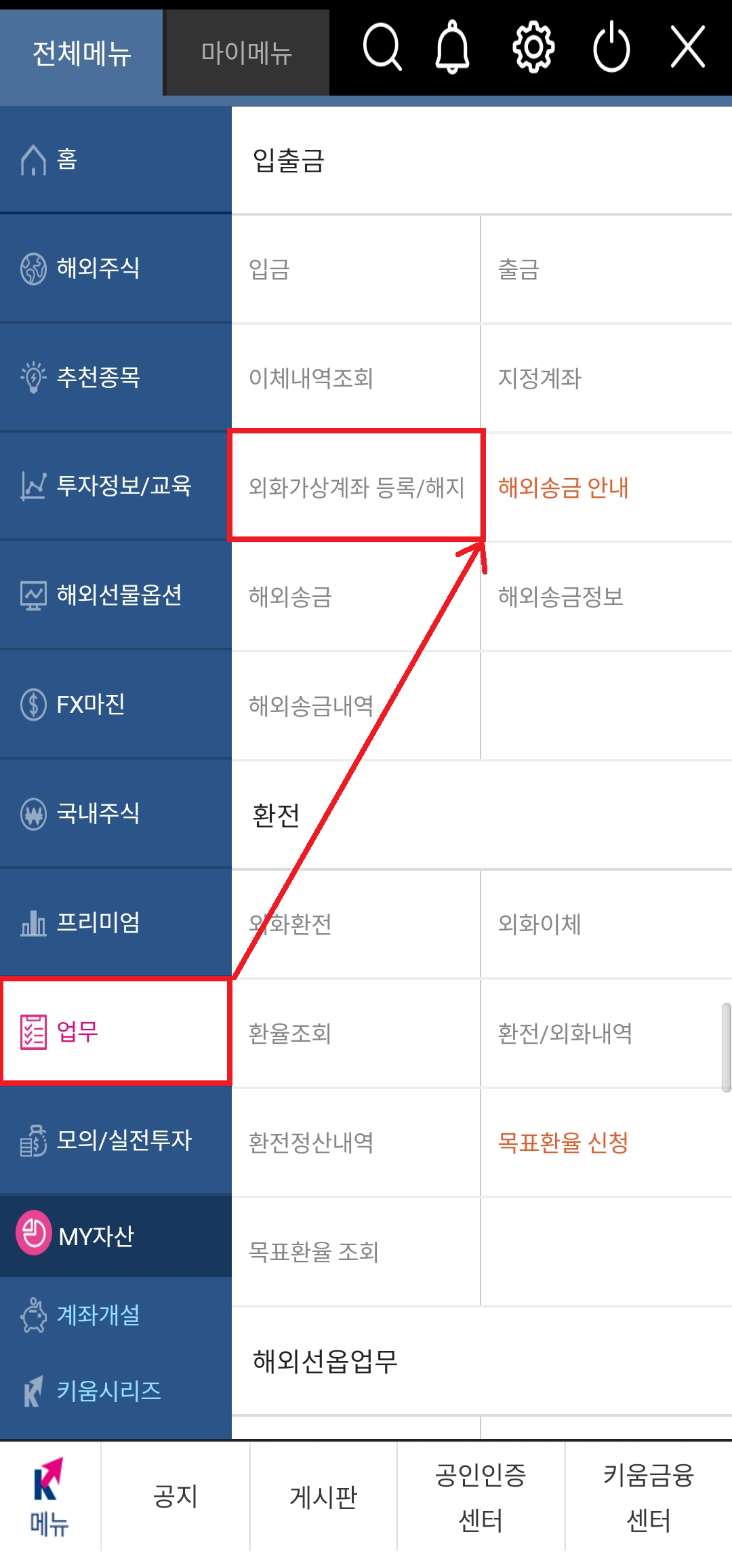 2. 앱을 실행하셨으면 메뉴 > 업무 > 외화 가상계좌 등록/해지를 차례로 누릅니다.