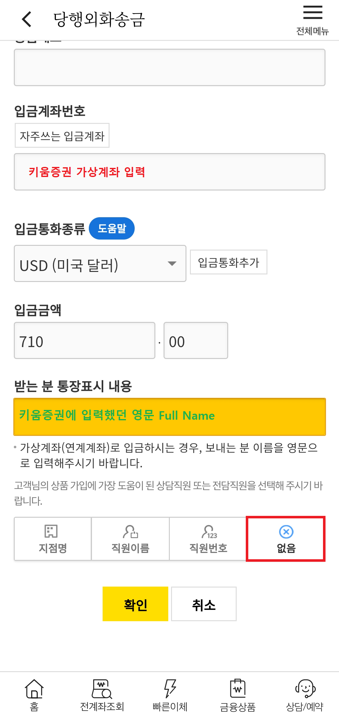 - 받는 분 통장표시 내용 : 키움증권에 입력했던 영문 Full Name