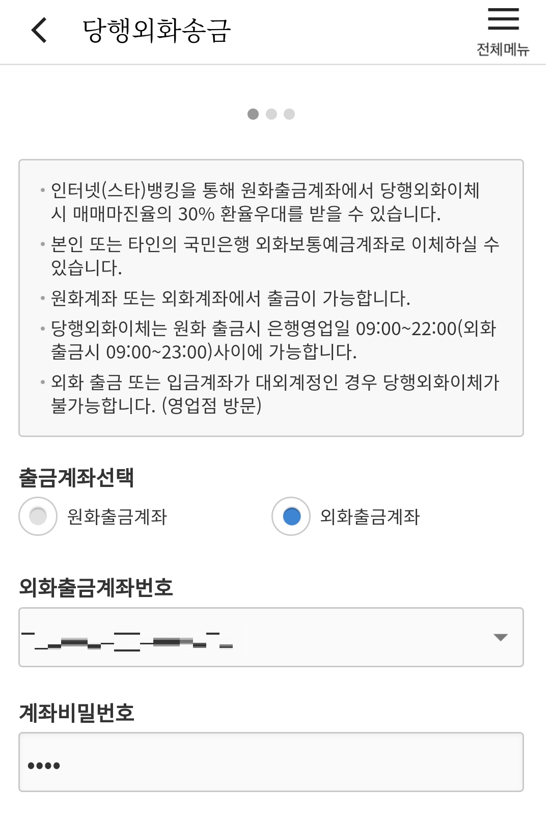 4. 외화출금계좌를 선택하고, 계좌번호와 비밀번호를 확인하여 입력합니다.