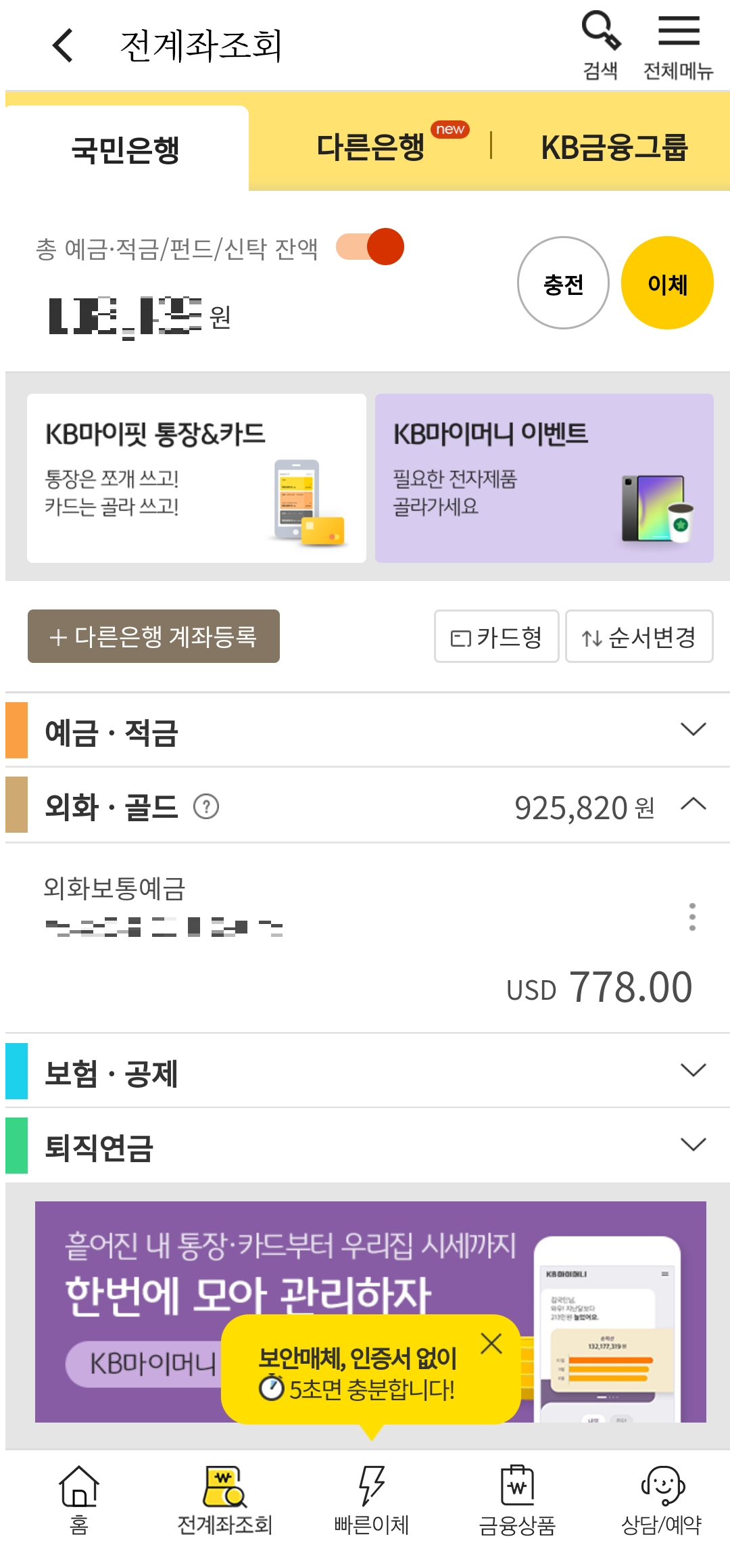 - 위와 같이 "KB스타뱅킹"앱의 전계좌조회 시 외화 골드 항목에서 잔액을 확인하실 수 있습니다.