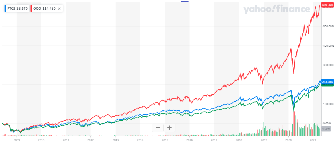 과거 데이터를 보면 QQQ에 투자한 것이 FTCS에 투자한 것보다는 좋은 성과를 냈습니다.