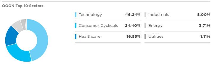 - QQQN은 기술주에 46%가량으로 가장 많이 투자되어 있습니다.