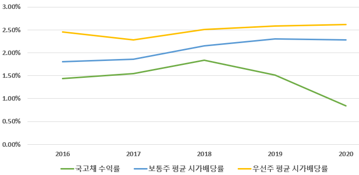 | 연도 | 국고채 수익률 | 보통주 평균 시가배당률 | 우선주 평균 시가배당률 |