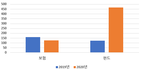 - 특히 연금저축펀드의 46.8만 건으로 2019년 대비 279.3% 증가되었지만, 연금저축보험은 12.6만 건으로 21.2%가 감소되었습니다.