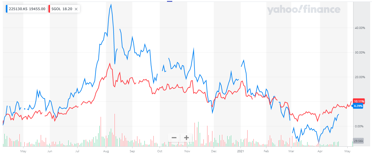 위 그래프는 2020년 5월부터 2021년 5월까지 미국 금 가격 1배 ETF인 "SGOL"과 비교한 그래프입니다.