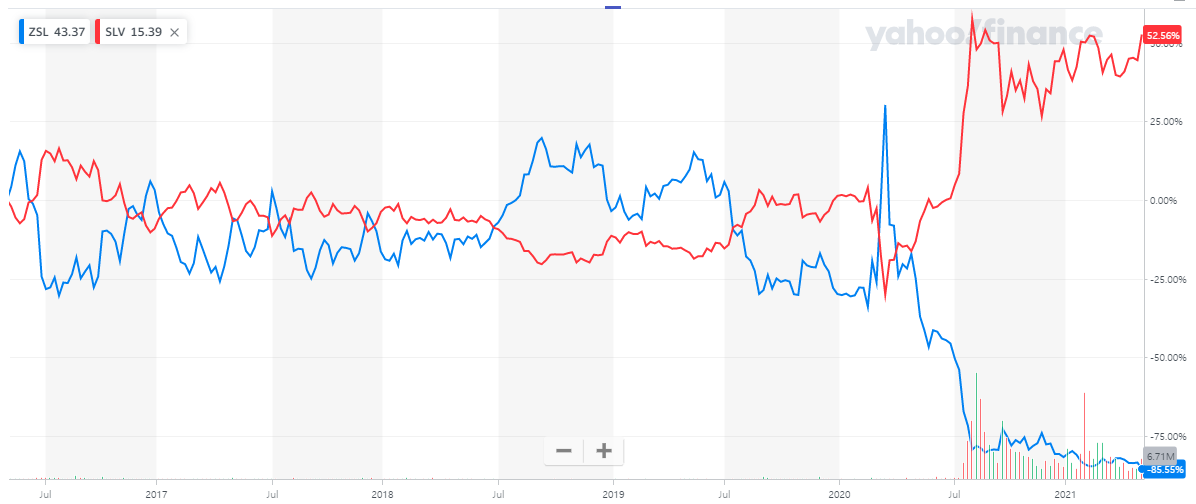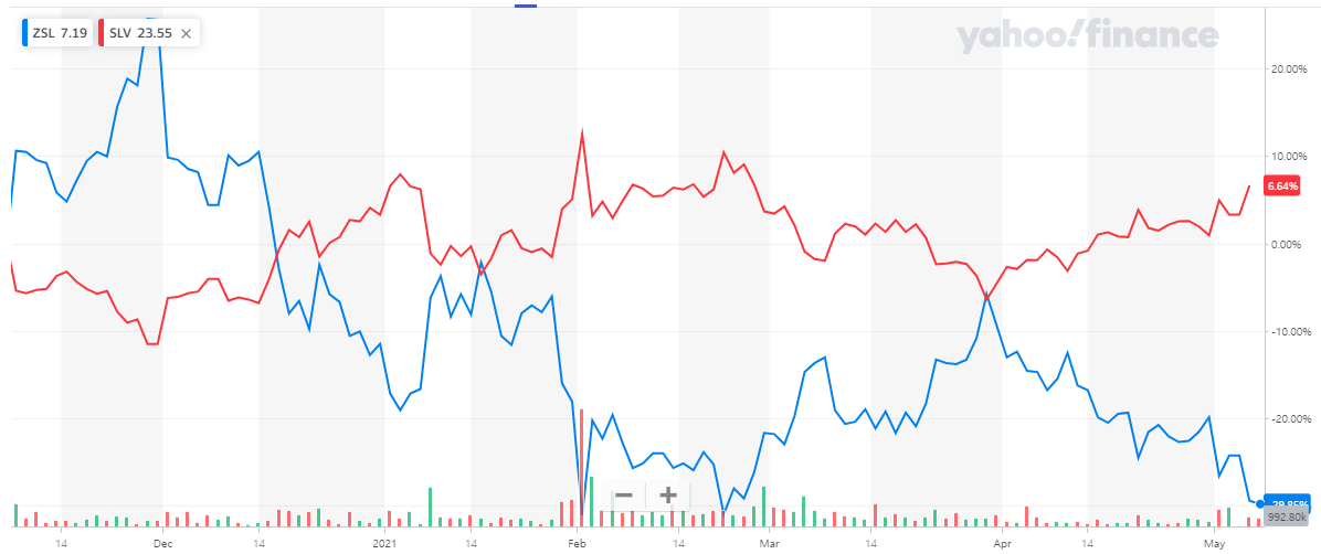 위 6개월간 보시는 바와 같이 ZSL은 은 가격과 반대로 움직이고 있습니다.