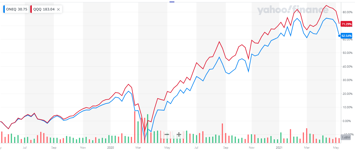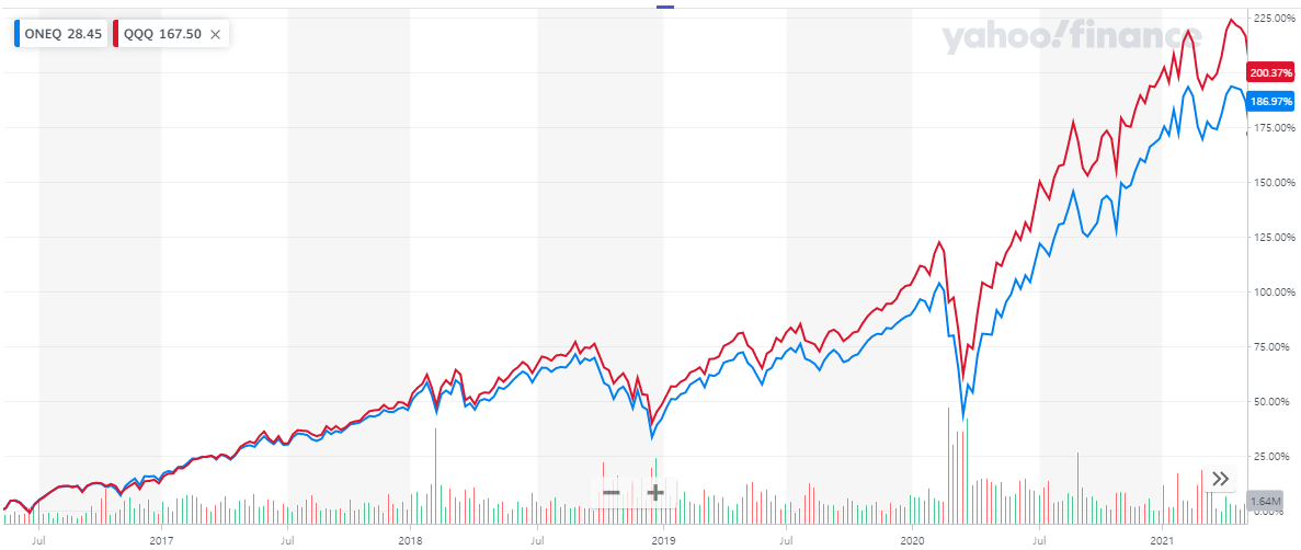 과거 5년부터 현재까지 ONEQ와 QQQ에 투자했더라면 QQQ의 수익률이 더 좋습니다.