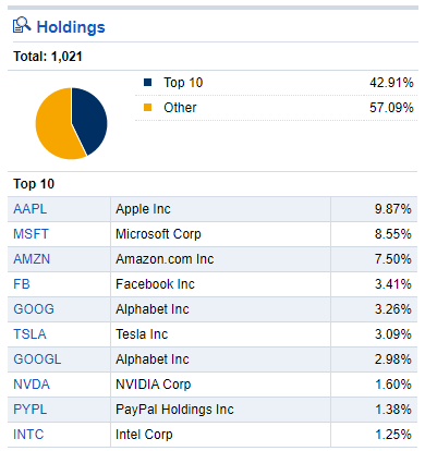 - 애플, 마이크로소프트, 아마존 등의 유명 기업들이 상위 구성 종목에 포함되어 있습니다.
