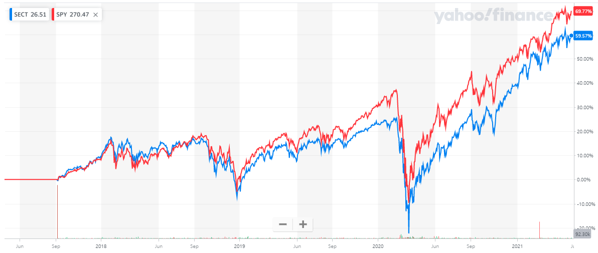 SECT가 상장한 2017년부터 2021년 5월까지의 수익률은 S&P500보다 더 좋았습니다.