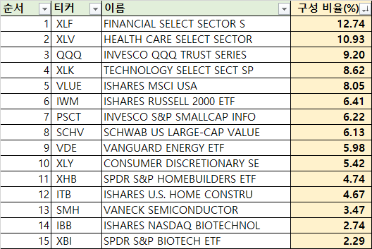 - 금융주의 XLF, 헬스케어의 XLV, 나스닥을 추종하는 QQQ, 기술주를 가지고 있는 XLK 등의 성장주 위주로 편입된 구성입니다.