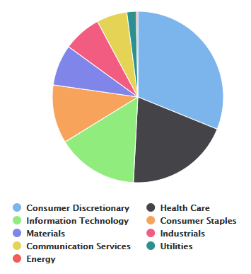 - 소비재가 약 34%로 가장 많이 포함되어 있고, 이외 헬스케어, 기술주, 원자재 순으로 구성되어 있습니다.