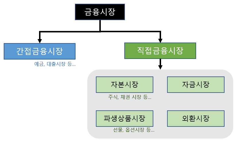 금융시장은 자금의 중개 방법에 다라서 "간접금융시장"과 "직접금융시장"으로 구분할 수 있습니다.
