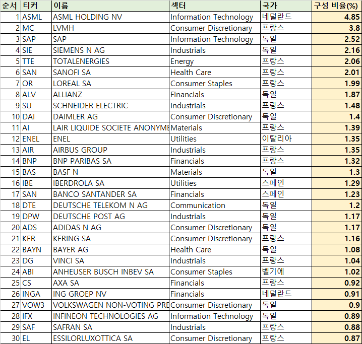 - 유로존 내 10개 선진국가에 투자하며, 유럽연합에 가입되어 있지 않거나 유로화를 사용하지 않는 국가는 제외됩니다. 대표적으로 영국이나 스위스, 스웨덴 기업은 제외됩니다.