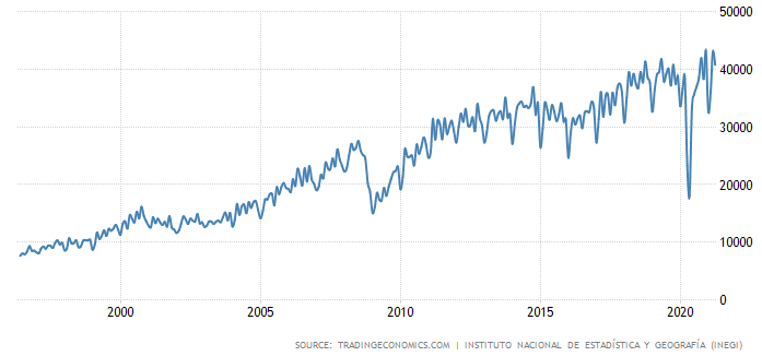 특히 멕시코는 2008년 금융위기와 2020년 3월의 코로나 19 사태를 제외하고는 항상 수출액이 늘어나는 긍정적인 경제 신호를 보여주고 있습니다.