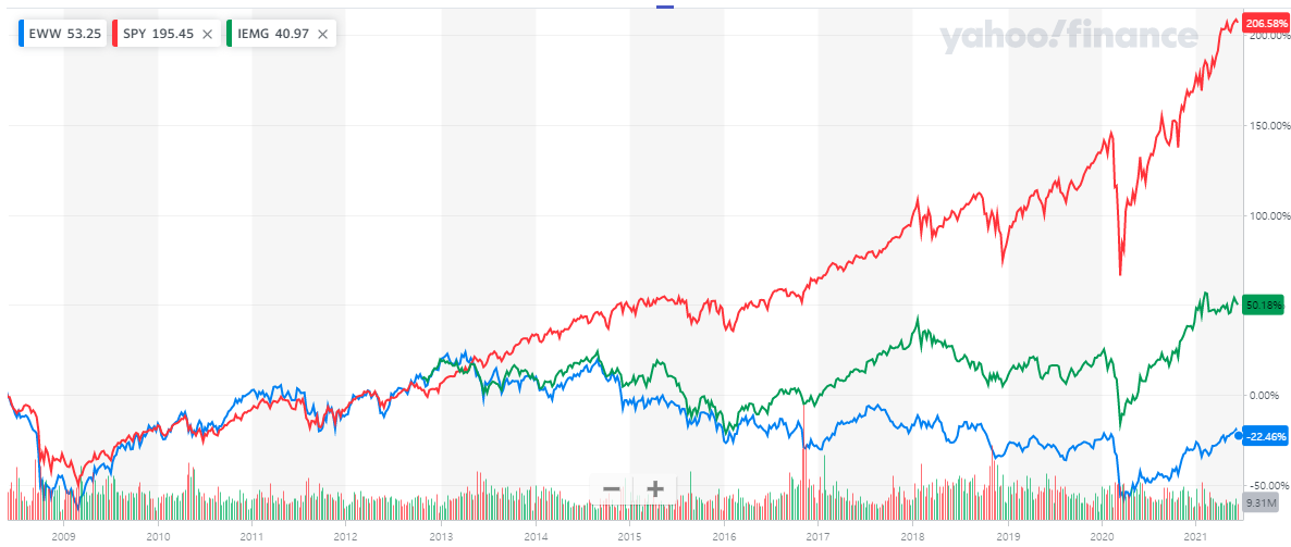 신흥시장에 투자하는 ETF가 2012년에 출시되었는데요, 현재 기준으로 50%의 성과를 보이고 있지만 EWW는 마이너스 수익률을 보이고 있습니다.