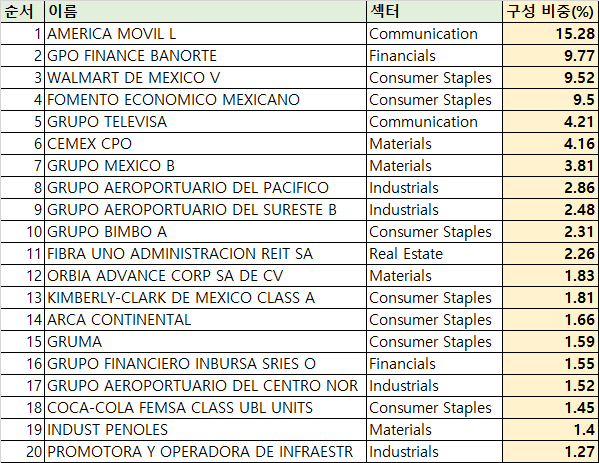- 상위 구성 종목에는 미국의 기업인 월마트, 킴벌리클라크의 멕시코 현지법인이 확인됩니다.