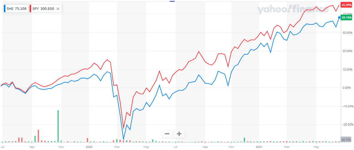 여성 친화적이고 양성평등 정책을 가지고 있는 회사들에 투자한다는 개념을 보인 최초의 ETF라고 하는데요, "성별 다양 성"이라는 주제를 실천하는 기업에 투자 및 후원한다는 발상은 좋지만, 결국 투자를 목적으로 하는 상품이기 때문에 "SHE"에 투자하는 메리트가 있을지 의문이 드네요.