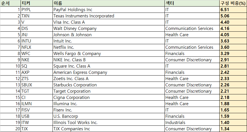 - 페이팔, 비자, 디즈니, 넷플릭스 등 우리가 흔히 아는 미국 대형주들이 상위에 구성되어 있습니다.