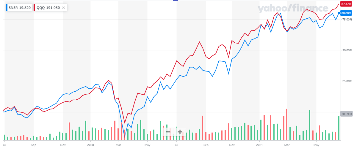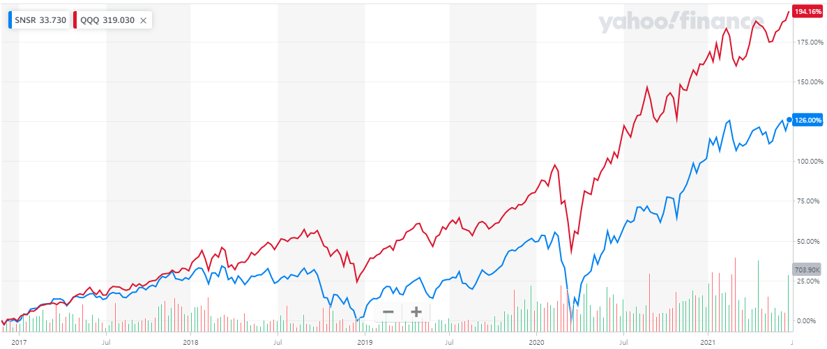 과거 5년동안 비교 대상인 QQQ는 194%의 성과가 확인되는데요, SNSR은 약 126%의 성과를 보여주고 있습니다. SNSR의 투자 성과도 좋은 편입니다.
