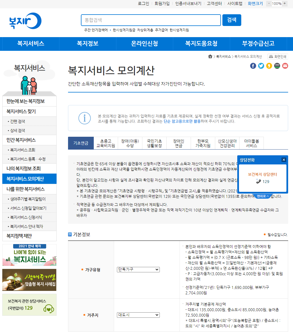 복지서비스 모의계산 - 복지로 함께 만드는 복지