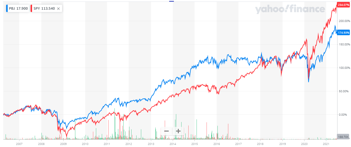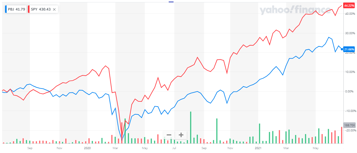 PBJ는 과거 2년간 SPY보다는 뒤지는 성과를 기록하였습니다.