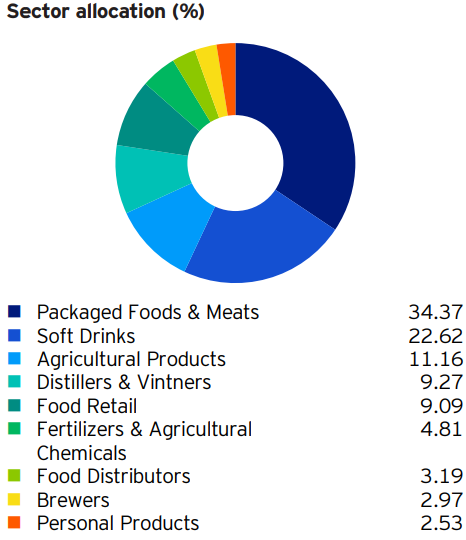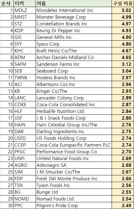 - 식음료 부문의 사업을 하는 30개 미국 상장 회사에 투자하는 ETF입니다.