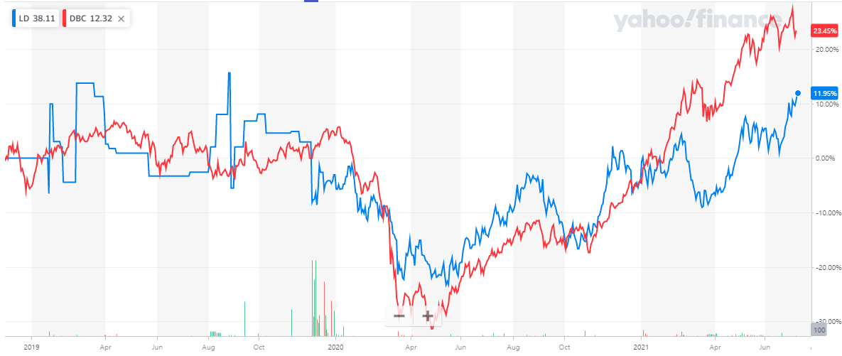 납에 투자하는 LD는 비교적 뒤지는 성과를 얻었는데요, DBC보다 변동성이 강한 그래프를 보이고 있습니다.