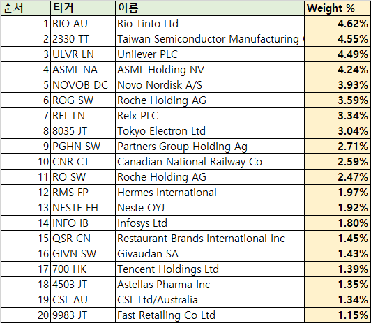 - 상위 20개 종목에 반도체 장비 회사인 ASML, 일본 도쿄전력, 중국 게임회사인 텐센트가 포함되어 있습니다.