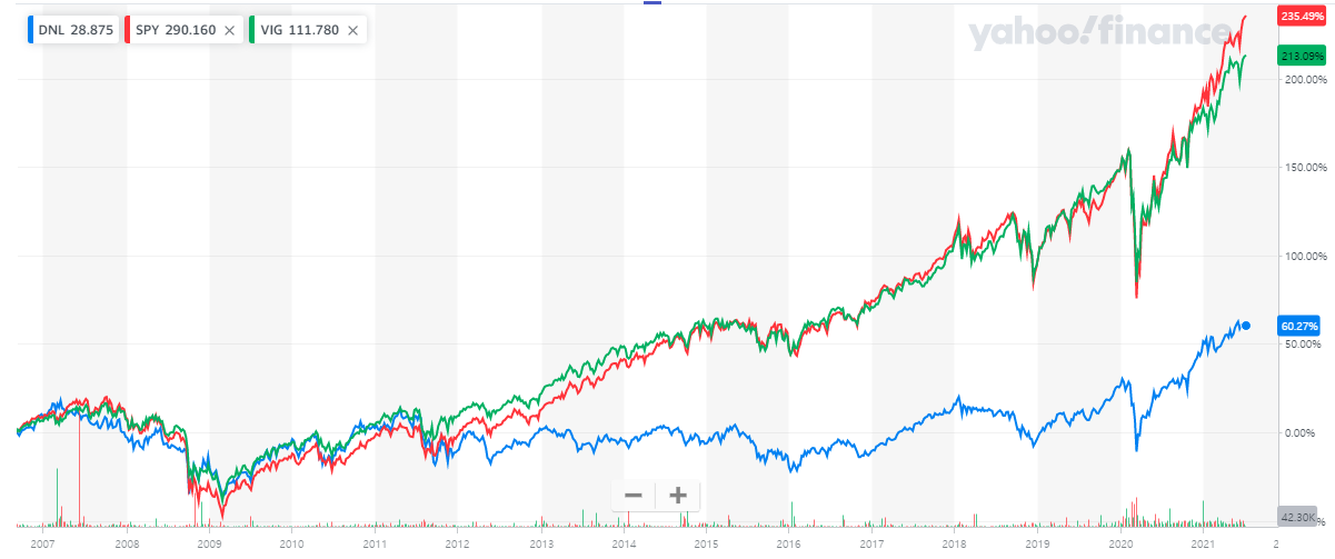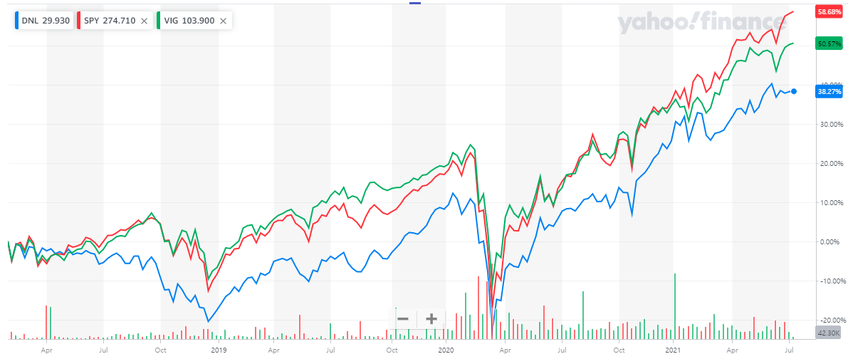 VIG 종목의 2년간 배당금은 DNL의 거의 2배에 육박하지만, 현재 주가를 감안한다면 DNL의 배당률이 더 높습니다.