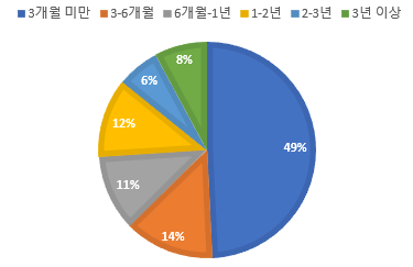 - 3개월 미만이 49%로 가장 많았고, 3개월에서 1년 사이의 소요기간이 25% 정도 차지하고 있습니다.