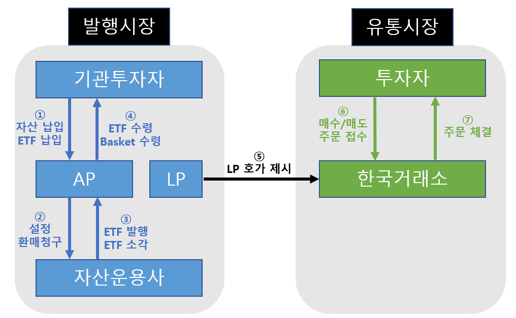 ETF를 만드는 과정부터 투자자가 ETF를 주문하는 데까지의 관계는 위와 같이 7개의 단계로 간략화할 수 있겠네요.