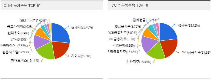 예를 들면 "KODEX 자동차" ETF 종목의 자산구성내역은 현대차, 기아차와 같은 자동차 종목을 구성하고 있고,