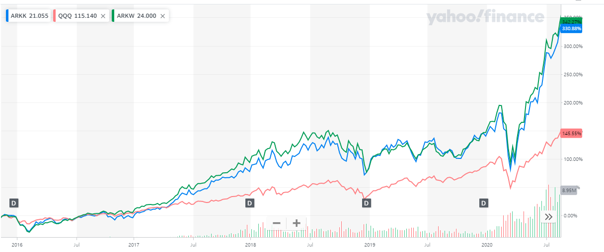 ARKK, ARKW는 QQQ를 2배 이상 가뿐하게 치고 나가는 성적을 보여줍니다.