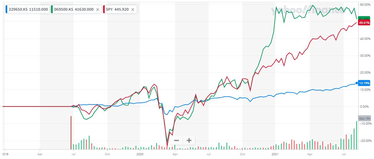 빨간색 : SPY(미국 S&P500 추종 ETF)