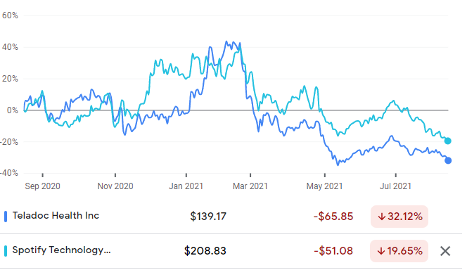 이 ETF에서 많은 비중을 가지고 있는 텔라닥, 스포티파이는 16%에서 33%까지 하락한 상황입니다.