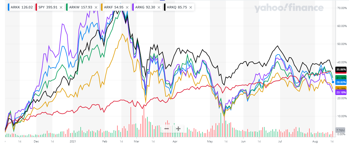 ARK ETF들의 연초 실적은 다소 좋지 않았지만 적어도 S&P500 지수에 투자하는 "SPY" ETF와 비교하면 변동성은 강했지만 자산의 상승률은 오히려 더 좋았습니다.