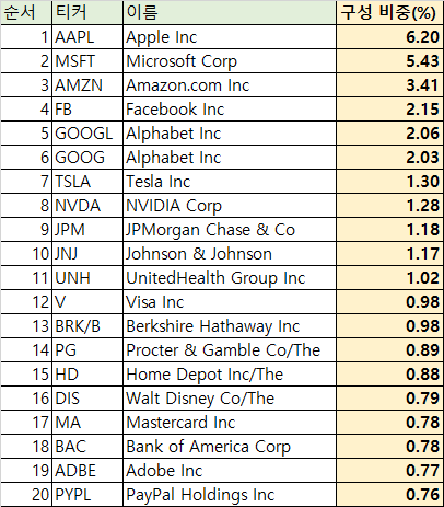 - 하위 구성 종목에 중형주가 포함되어 있다는 점만 제외한다면 S&P500의 변형입니다.