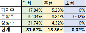 - 대형주가 81%, 중형주에 18%에 투자되어 있는 "대형주 중심에서 중형주를 일부 포함"한 구성입니다.