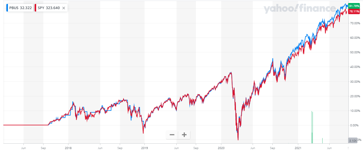 PBUS가 상장한 2017년 9월 이래로 S&P500과 거의 비슷한 성과를 보여주고 있었습니다.