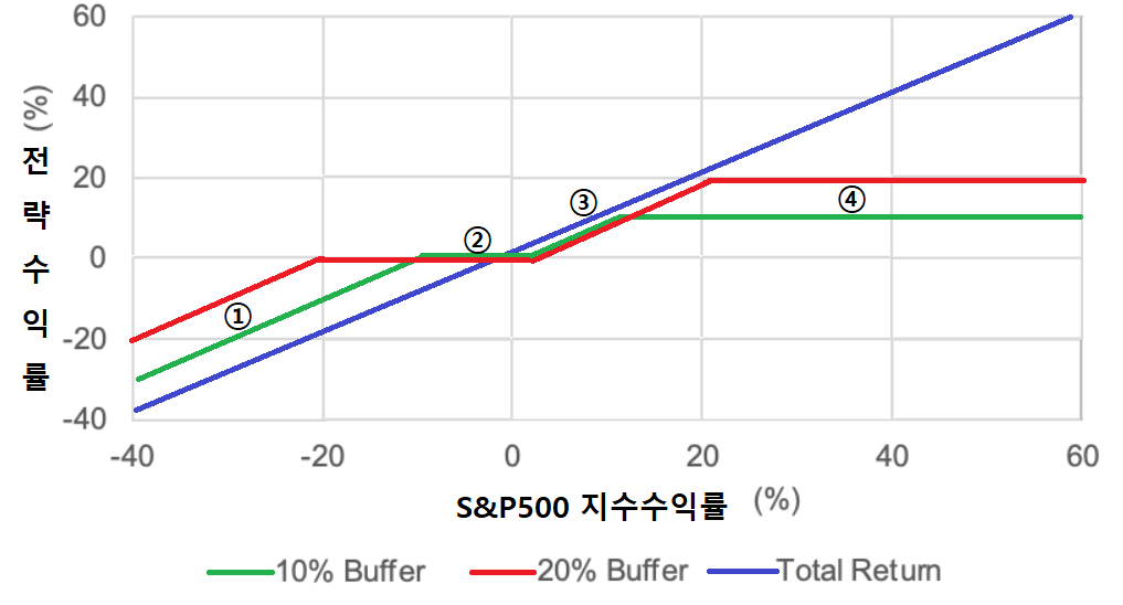 위 표는 특정 지수에 대해서 버퍼를 둘 때 수익률이 어떻게 나타날 수 있는지 나타낸 표입니다.