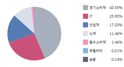 - 골프와 관련된 산업에 투자하는 종목답게 경기소비재가 가장 많은 비율을 가지고 있으며, IT, 산업재의 투자비율이 높습니다.
