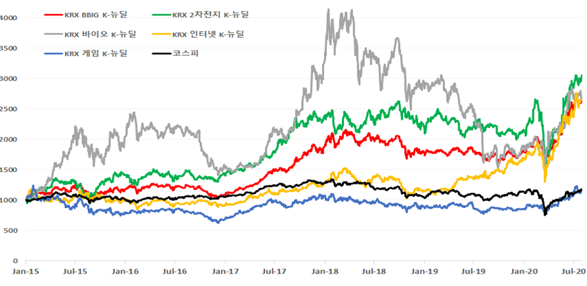 한국거래소(KRX)는 이러한 상황 속에서 앞으로 "한국 경제의 패러다임 전환"을 견인할 수 있는 선도기업으로 구성된 "KRX BBIG K-뉴딜지수"를 만들었습니다.