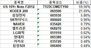 KODEX 200이 21%를 차지하고 있고, 나머지 비율은 KOSPI의 시총 상위 기준으로 보유하고 있습니다.