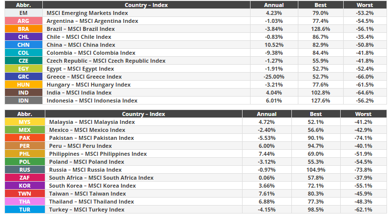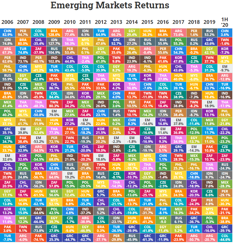 위 표는 2006년부터 2020년까지 신흥시장의 주식시장 이익률을 나타낸 표입니다.