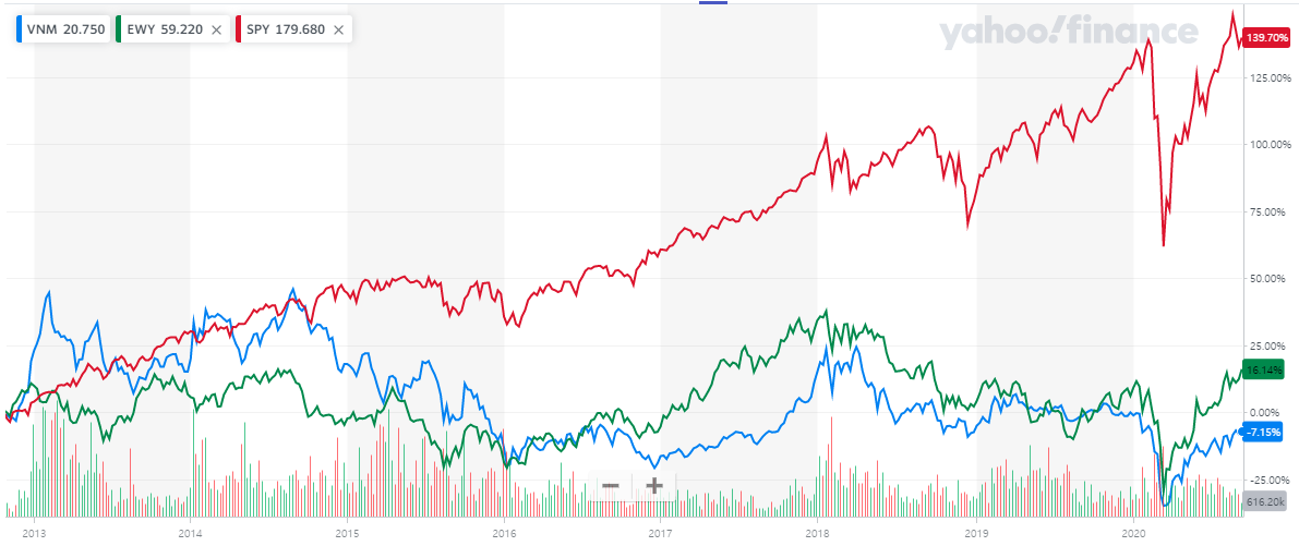 2013년 초부터 VNM(베트남 주식)을 한국 주식(EWY), 미국 주식(SPY)와 비교한 그래프입니다.