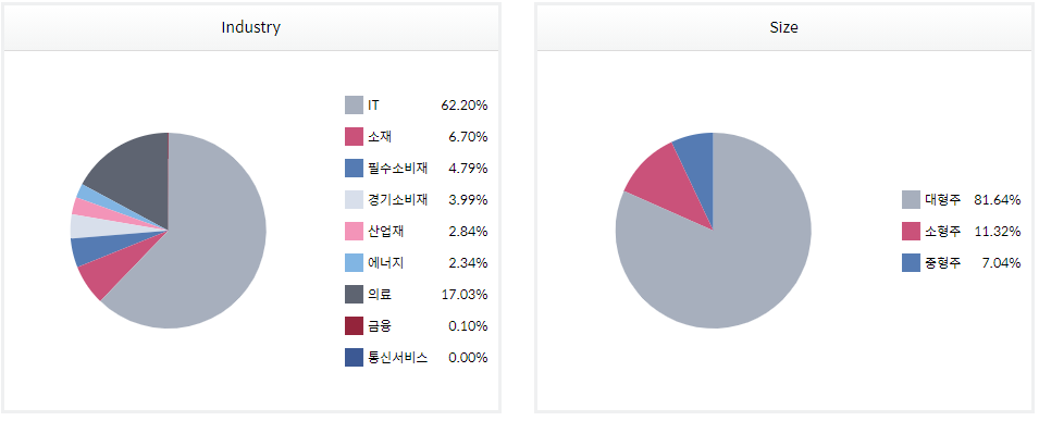 - 2020년 9월 21일 기준으로 대형주 81%, 중소형주 18%로 구성되어 있는 대형 성장주 위주의 지수입니다.