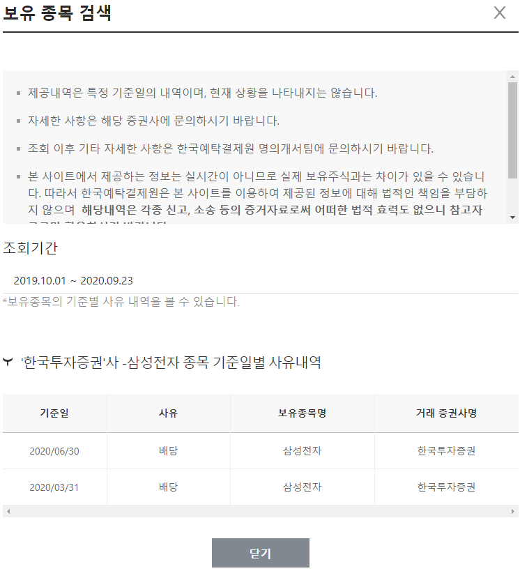 조회 기간은 최대 1년으로, 제공 내역은 특정 기준일의 내역이기 때문에 현재 시점의 주식 보유현황이 나타나지는 않습니다.