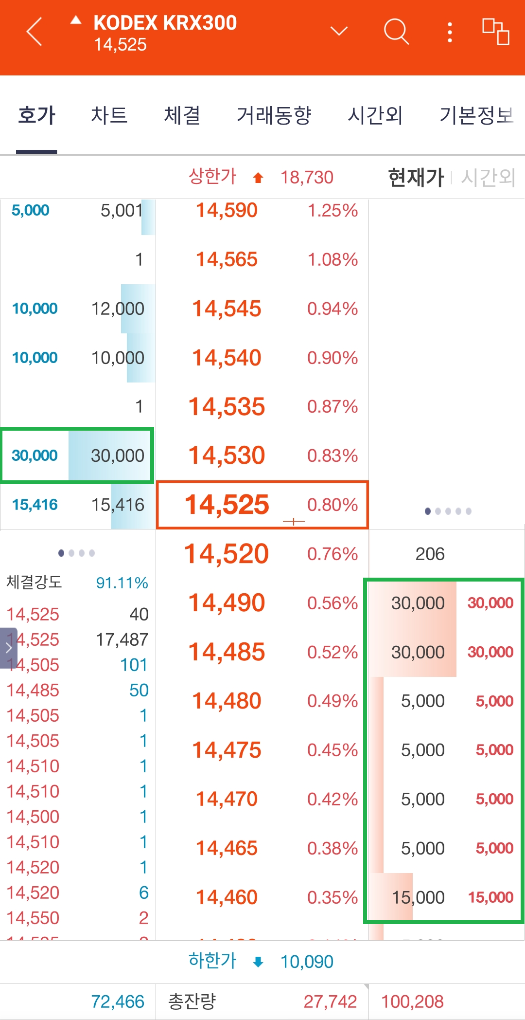 위 그림은 한국투자증권 MTS에서 "KODEX KRX300" ETF의 호가창입니다.