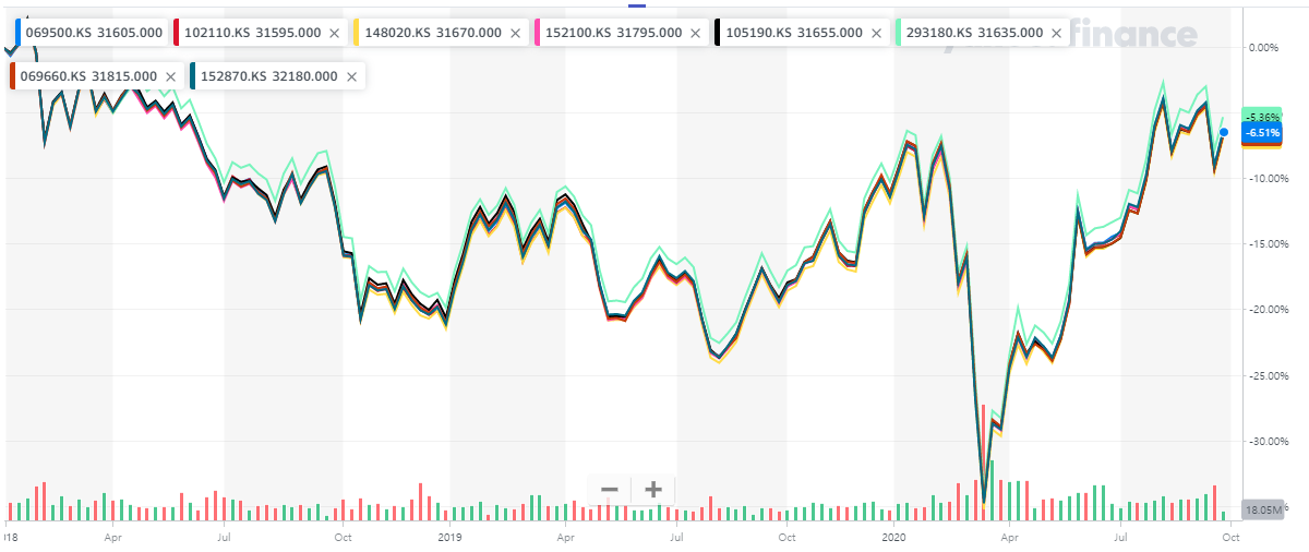 보시는 바와 같이 큰 차이는 없어 보이는데요, HANARO 200의 경우 무슨 이유에서인지 타 종목과 등락 차이가 약간 있는 것 같습니다.